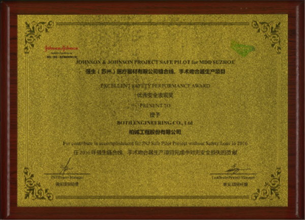 近期,我司項(xiàng)目團(tuán)隊(duì)在強(qiáng)生(蘇州)醫(yī)療器材有限公司縫合線、手術(shù)吻合器生產(chǎn)項(xiàng)目中,對無安全損失做出了貢獻(xiàn),被業(yè)主授予”優(yōu)秀安全表現(xiàn)獎”。