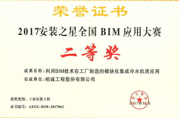 2017年12月,在中國(guó)安裝協(xié)會(huì)主辦的2017“安裝之星”全國(guó)BIM應(yīng)用大賽中,我司參賽作品“利用BIM技術(shù)在工廠制造的模塊化集成冷水機(jī)房應(yīng)用”喜獲二等獎(jiǎng)。