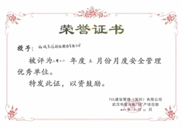 2022年5月,BOTH武漢華星T5項(xiàng)目團(tuán)隊(duì)喜獲五月份月度安全管理優(yōu)秀單位殊榮,安全主管被評(píng)為月度安全管理先進(jìn)個(gè)人。