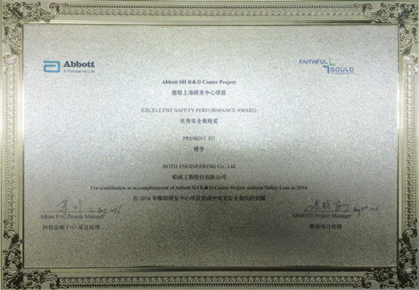 2016年9月,公司上海雅培項(xiàng)目部在2016年雅培研發(fā)中心項(xiàng)目完成中無(wú)安全損失,業(yè)主及管理方特此頒發(fā)“優(yōu)秀安全表現(xiàn)獎(jiǎng)”以示表彰。