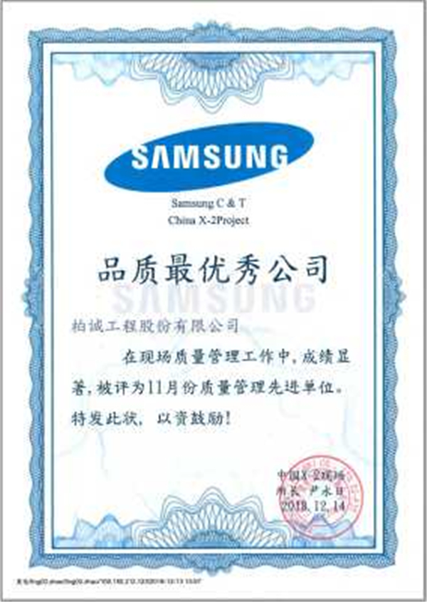 我公司西安三星項(xiàng)目部在西安三星X2項(xiàng)目的現(xiàn)場(chǎng)質(zhì)量管理工作中,成績(jī)顯著,受到業(yè)主和管理公司的表彰,被評(píng)為11月份質(zhì)量管理先進(jìn)單位。