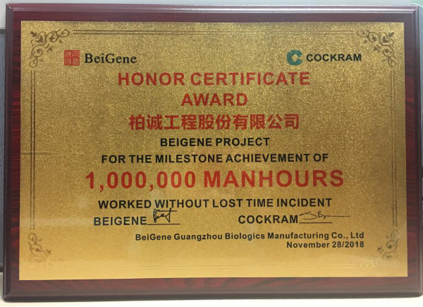 2018年12月,公司在廣州百濟(jì)神州生物制藥有限公司新廠建設(shè)項(xiàng)目中喜獲“100萬安全工時(shí)榮譽(yù)證書”