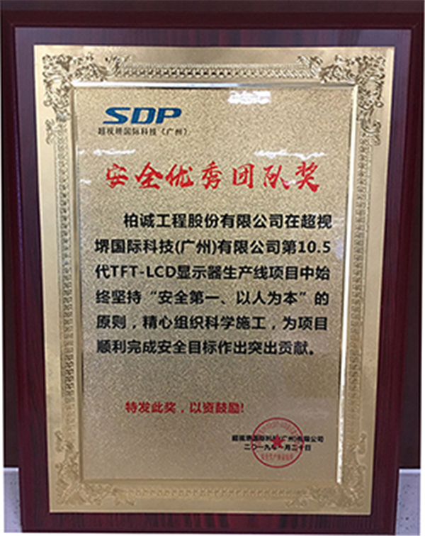 我公司承建的超視堺國際科技(廣州)有限公司增城817建廠專案項(xiàng)目開工至今,安全工作高效,實(shí)現(xiàn)了“安全零事故”目標(biāo),因此業(yè)主方廣州超視堺國際科技有限公司向我公司SDP項(xiàng)目部頒發(fā)了“安全優(yōu)秀團(tuán)隊(duì)獎”予以表彰,同時項(xiàng)目安全主管張高飛獲得“安全生產(chǎn)先進(jìn)個人”證書。