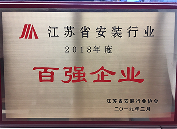 2019年3月,公司收到江蘇省安裝行業(yè)協(xié)會頒發(fā)的2018年度江蘇省"安裝百強企業(yè)"獎狀。